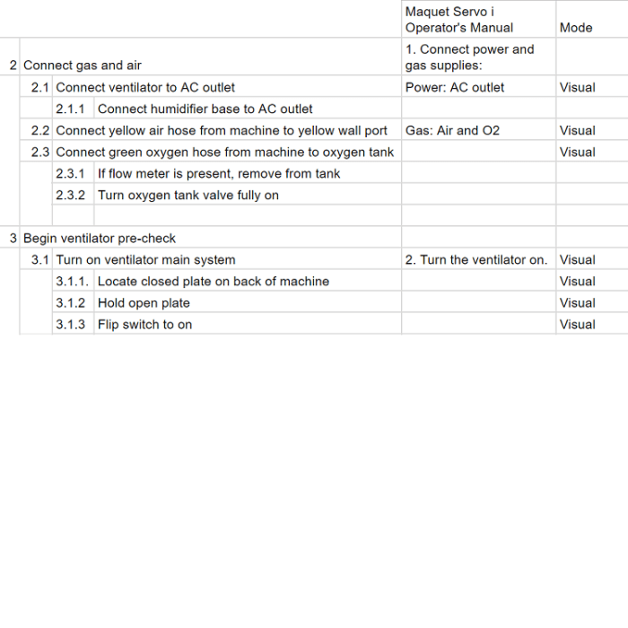 After interviewing experts, we chose a medical ventilator setup procedure as our task for this study. We conducted a contextual inquiry with an expert to see how to complete the task. Using this information and information from online resources (including video tutorials for the ventilator), we created a hierarchical task analysis (pictured on left).