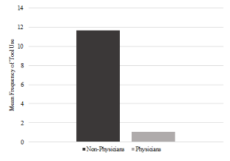 We analyzed the data comparing physicians to non-physicians in their behaviors while using the tool. We found that non-physicians relied on the tool more often than physicians, as seen in the graph below.