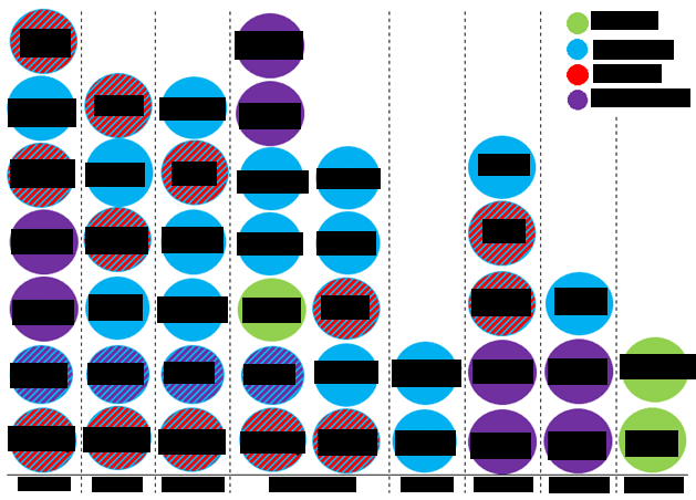 To make understanding these requirements easier, I created a visualization which categorized personas based on the type of person (color), the persona (individual dots), and the task those personas must be able to complete on the website (horizontal axis). This helped the design team to visualize which tasks were most important for all users (task 4) and which tasks were only needed for specific types of users (tasks 5 and 8). This allowed the team to prioritize certain tasks, while still remaining aware of how the other tasks were important to different users.